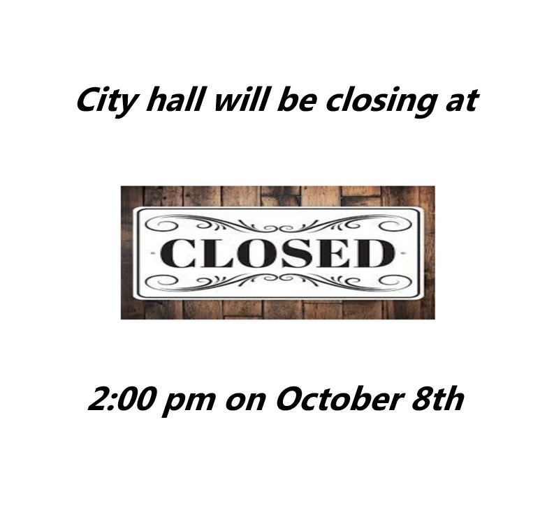 Posted on October 6, 2025, Edited October 6, 2025 by Cindy City Hall Closed City Hall will be closing at 2:00 pm on October 8th for training.